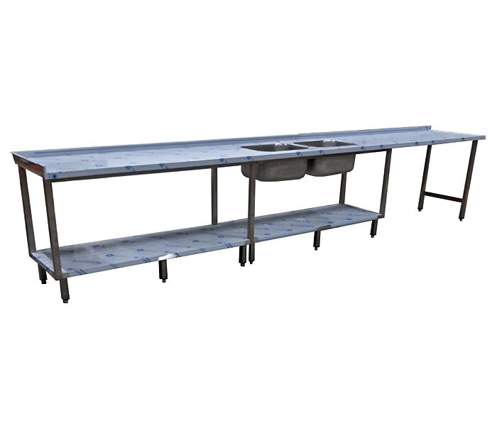 De spoeltafel is voorzien van een geborsteld roestvastsalen AISI 304 blad met een dikte van 1,25mm (40mm dik in het zicht, dubbel omgezet). Het blad wordt onderlijmd met vochtwerend melamine hydrospan (FSC gecertificeerd). Het frame is vervaardigd van koker 40x40x1,25mm en is voorzien van roestvrijstalen-look stelpootjes, welke 30 Ã 40mm in hoogte verstelbaar zijn.