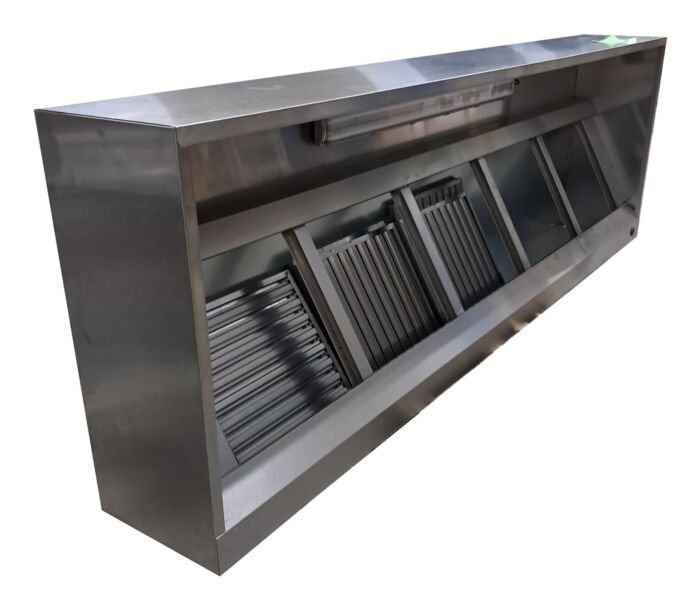 De Hakpro 950 Wandkap Doosmodel 3000 is een roestvaststalen afzuigkap in doosmodel. De kap wordt geleverd met 5 filters en is voorzien van schuingeplaatste lamellen. De wandkap is uitgerust met een aftap. De ingebouwde verlichting biedt meer comfort aan uw werkplek.